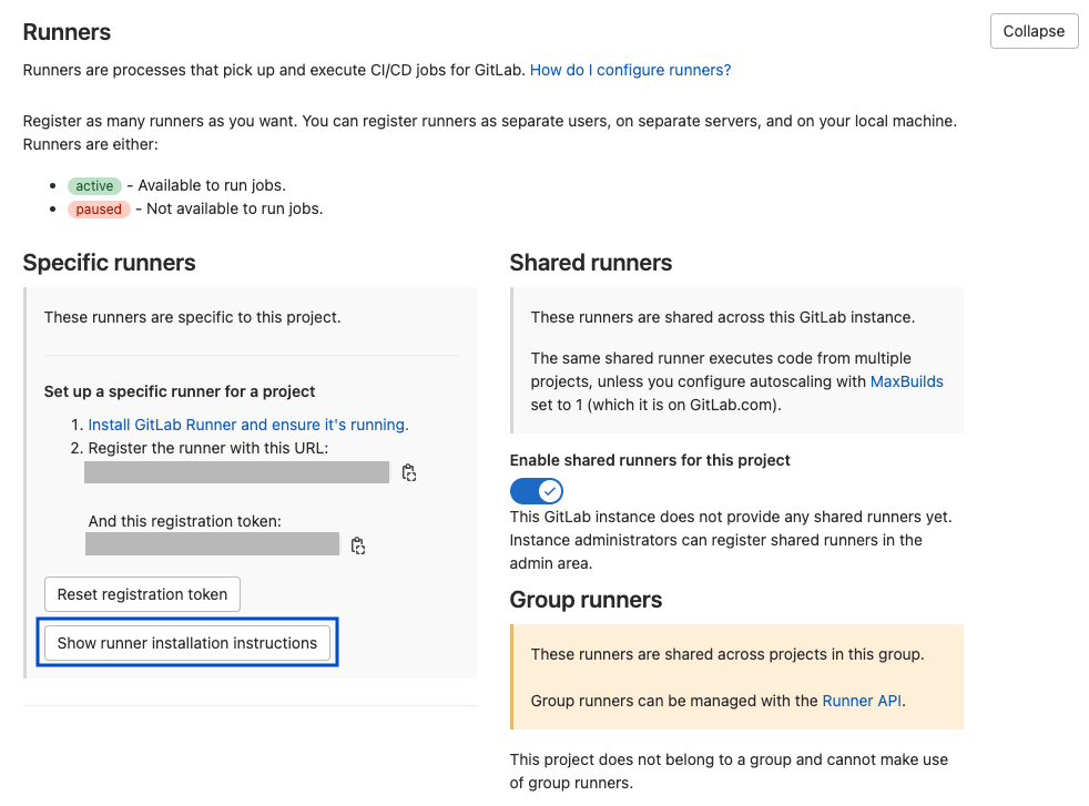 안내가 요구한 대로 Settings > CI / CD 메뉴에서 Runners 탭을 활성화 시켜줍니다.