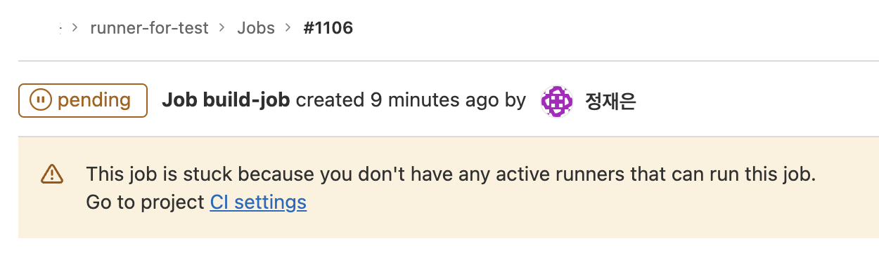 CI / CD > Jobs 를 확인해보면 활성화된 Runner 가 없다는 에러가 발생했다는 것을 확인할 수 있었습니다.