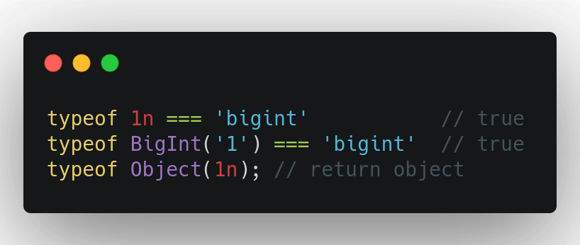 BigInt 는 n정수 (예 :) 에 더하거나 를 5n호출 하여 생성됩니다.
